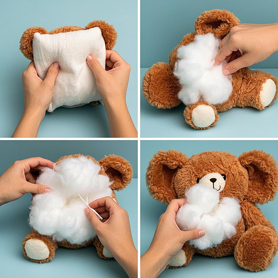 Demonstrate how to evenly fill the inside of a stuffed animal with cotton padding
